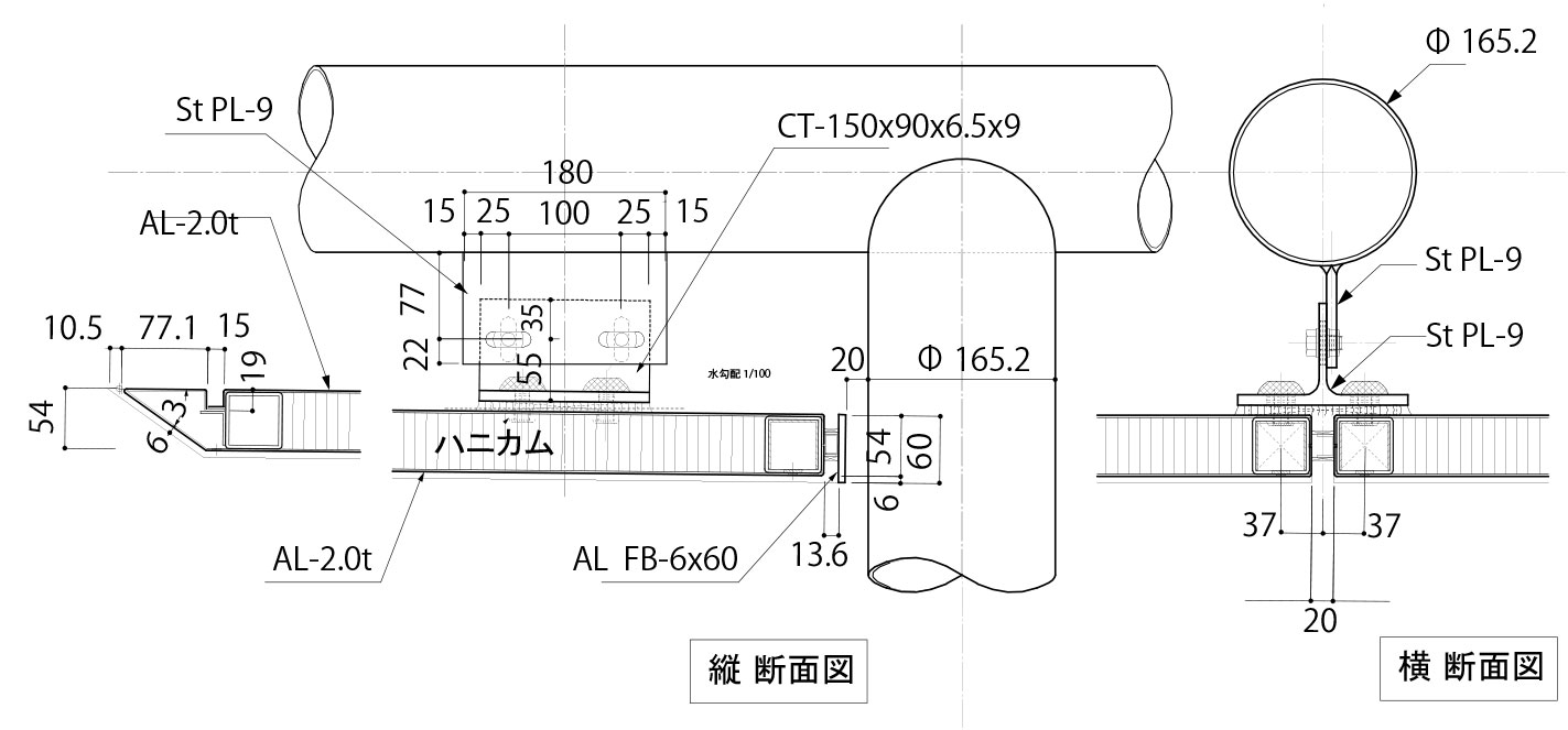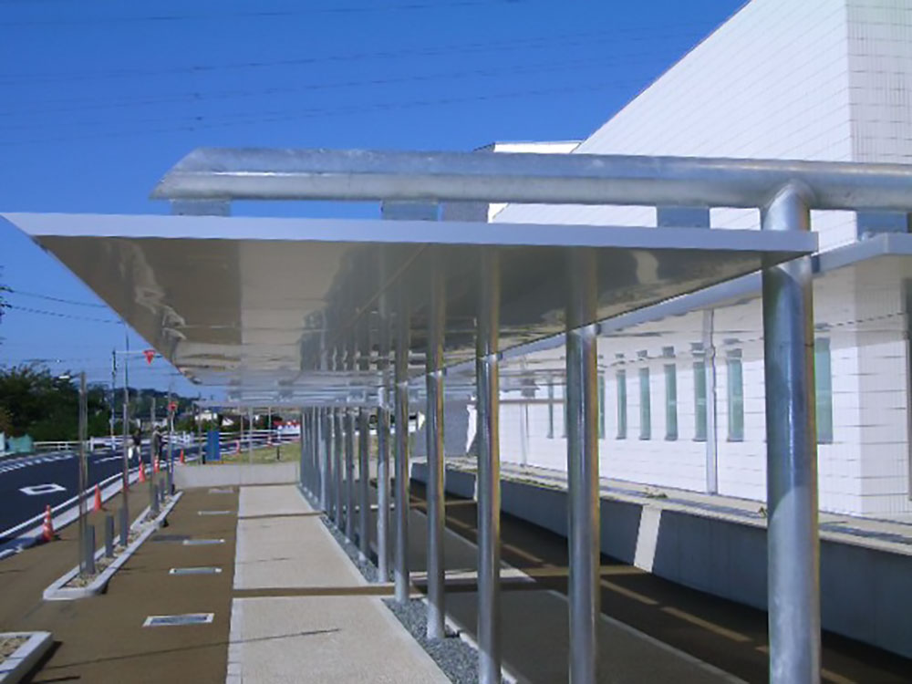 丸パイプの柱と梁のフレームの美しさを活かすため、限りなくシンプルな納まりを追及した庇です。