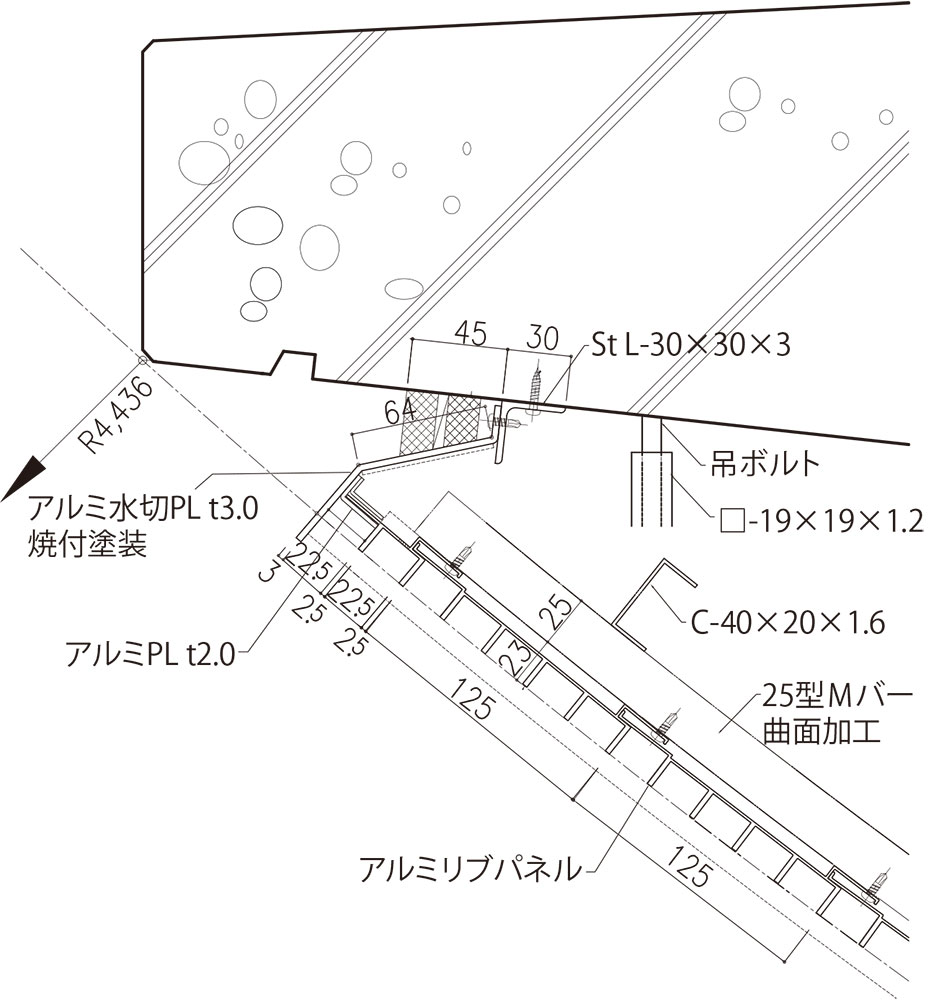 スパンドレルによる曲面の軒天井