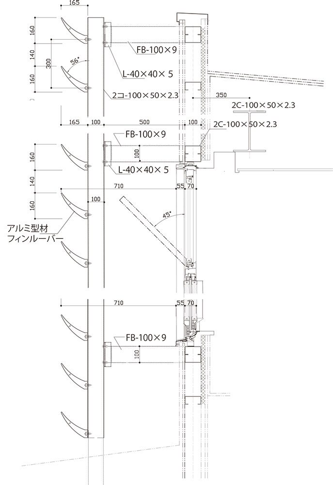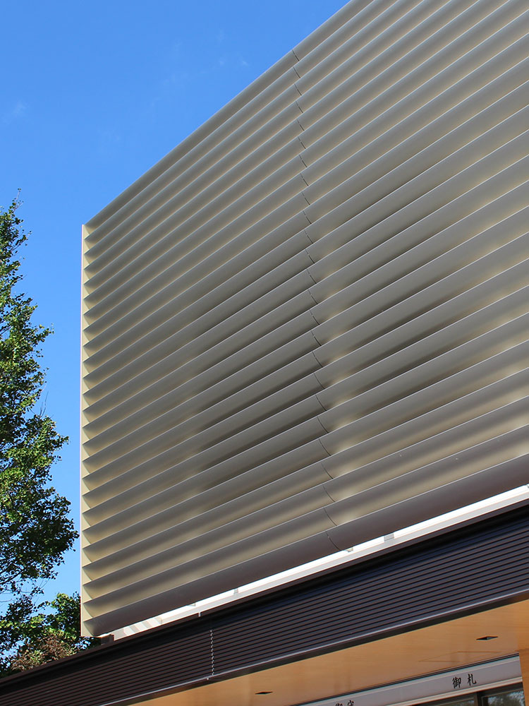 中空フィンにより建物正面にある排煙窓を隠して、やわらかい障子のようなスクリーンに仕上げています。