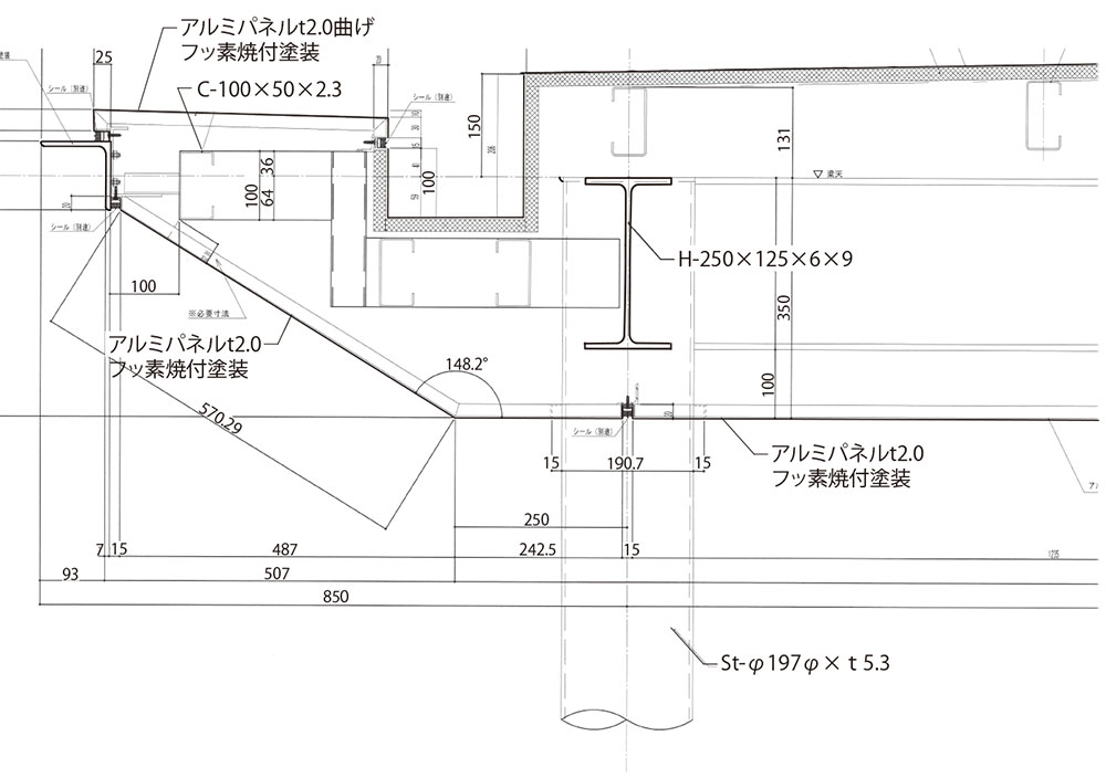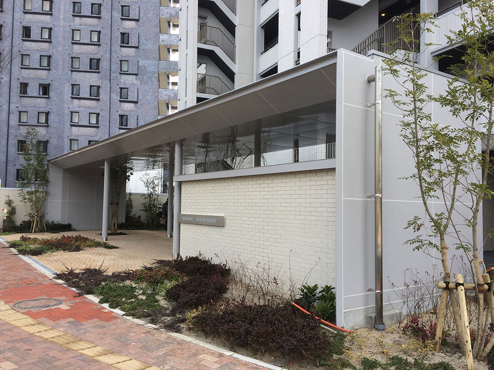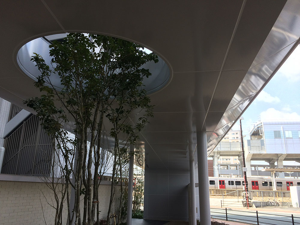ガルバニウム鋼板による在来的な工法ながら、エッジの効いた端部や植栽のための大開口で、マンションを象徴するデザインとなっています。